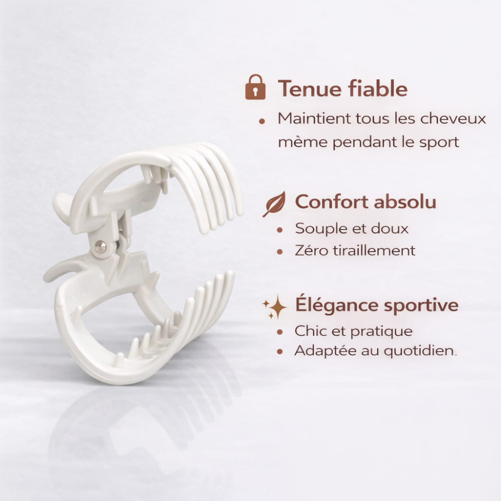 Cette pince souple et grande maintient tous tes cheveux en place, que ce soit pendant le sport ou au quotidien.